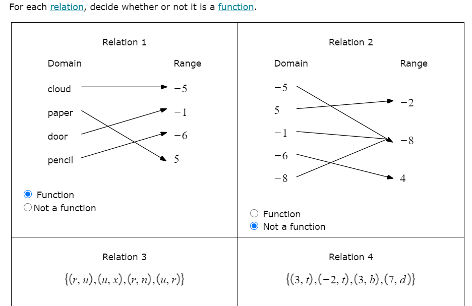 A special type of relation, called a function, occurs extensively in mathematics. Like a relation, a function has a domain and range made up of the x and y values of ordered pairs. In mathematics, what distinguishes a. In functions and function notation, we were introduced to the concepts of domain and range. Grasp the fundamental principles of relations and functions and acquire the ability to represent them using various formats like set notations, tables, graphs,. Determine if a relation is a function. The domain consists of all permissible input values. In this section, we will practice determining. Understanding the domain and range of a relation is crucial in mathematics, particularly when delving into functions. If a function is defined by an equation, then the range of the function is the set of “possible outputs,” the values that can be created by plugging in different \(x\) values.